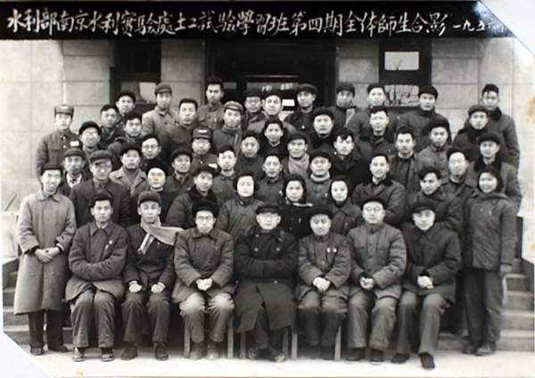 五十年代初由于我国水利、水运、水电事业迅速发展,水利科技人才相当缺乏。在这种情况下,我院先后开办了多期水文技术人员培训班、土工试验学习班,水工试验学习班,系统讲授有关专业技术知识和试验操作技术。这批学员回到本单位后大多在本地区、本系统的水利科学研究所或水工试验室、土工试验室中发挥了骨干作用,许多人在科研业务工作或科研管理工作中作出了重要贡献,走上了各级领导岗位。图为第四期土工试验学习班全体合影(前排右1邹思楙,右2汪闻韶,右3朱维新,右4黄文熙,右5蒋彭年,左1汤先骏;二排右2郭祖继,左2曹健仁;三排左1郭崇元;后二排右3葛祖立;后三排左1李君纯)
