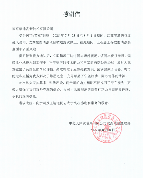 近日,南京瑞迪高新技术有限公司(以下简称“瑞迪高新”)收到中交天航局太湖生态清淤项目部发来的感谢信,对公司在台风“竹节草”侵袭期间的紧急驰援表达诚挚谢意。